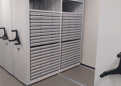 Металлические стеллажи с ящиками полного выдвижения для хранения в архиве или библиотеке бумаг, документов, карт, CD дисков.