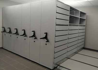 В металлических стеллажах нашего производства может быть любое количество выдвижных ящиков. В одной секции они могут быть разной высоты. И как правило, занимают по высоте не весь стеллаж, а до 1,5 метра, что добавляет комфорта в работе с хранимыми документами или иными объектами. Для эффективного использования пространства архива в секции стеллажа дополнительно можно расположить полки. В случае потребности, ящики занимают по высоте весь стеллаж до высоты 3,5 метра. Мобильные стеллажи позволяют хранить на ограниченной площади в два раза больше документов.
