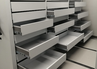 Карты хранятся в ящиках, стеллаж закрывается дверью с замком.