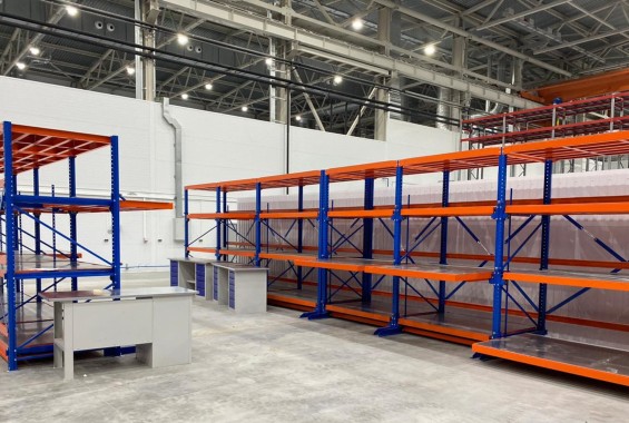 При монтаже стеллажей в линейку верхние полки стеллажей используются для хранения длинномерного груза.