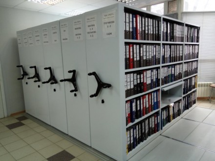 Системы компактного архивного хранения документов. Вдвое повышается вместимость или сокращаются занимаемые площади. Используются двухсторонние передвижные стеллажи для архивохранилища.